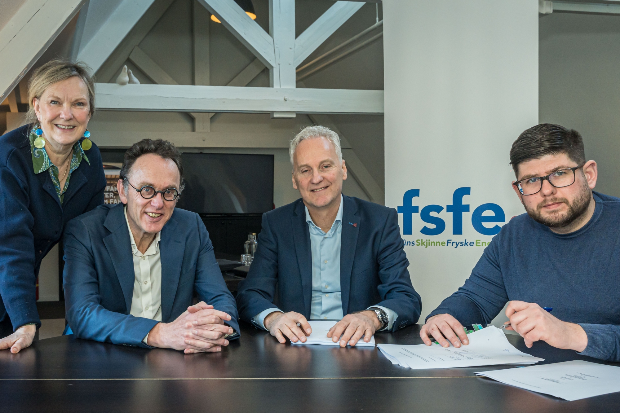 Op de foto v.l.n.r.: Marieke van der Werf, voorzitter RvC FSFE, Michel Hendriks, directeur FSFE, Bert van der Weerd, manager fondsmanagement SVn, Sijbe Knol, gedeputeerde van de Provincie Fryslân.